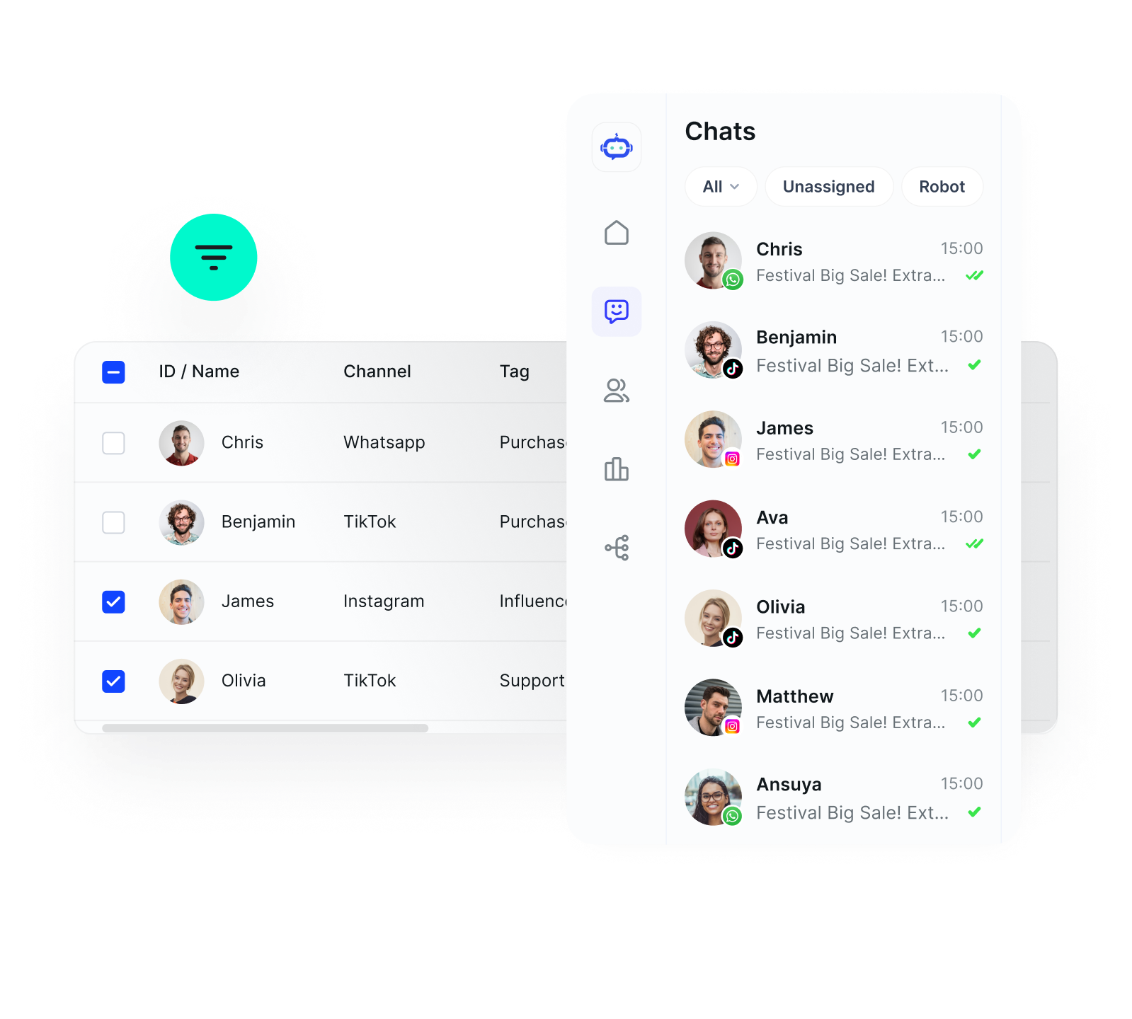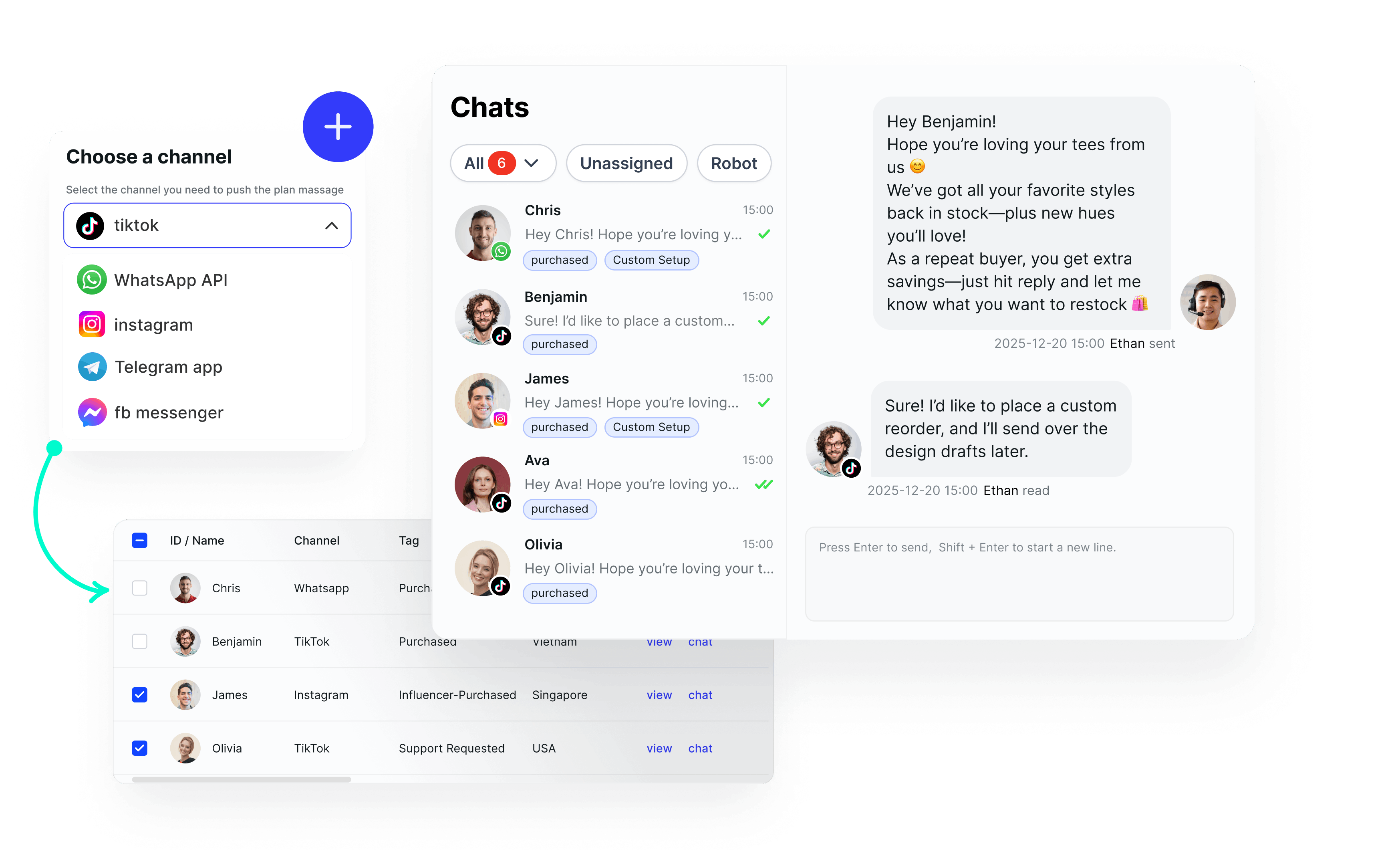 Send messages to multiple channels simultaneously, including WhatsApp, Messenger, Instagram, and TikTok, with a single click, ensuring consistent content and improving reach efficiency.